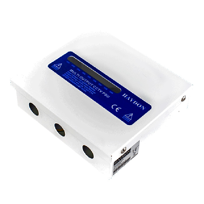 Haydon Multi-Output CCTV Power Supplies 9 Outputs, 5 Amp 12VDC PSU with up to 9 outputs, metal boxed 12VDC 5A power supply for CCTV cameras supports up to 9 outputs with a maximum total power output of 5 Amps. The professional power supply provides a high-quality low noise regulated DC power supply with a PTC fuse overcurrent protection.