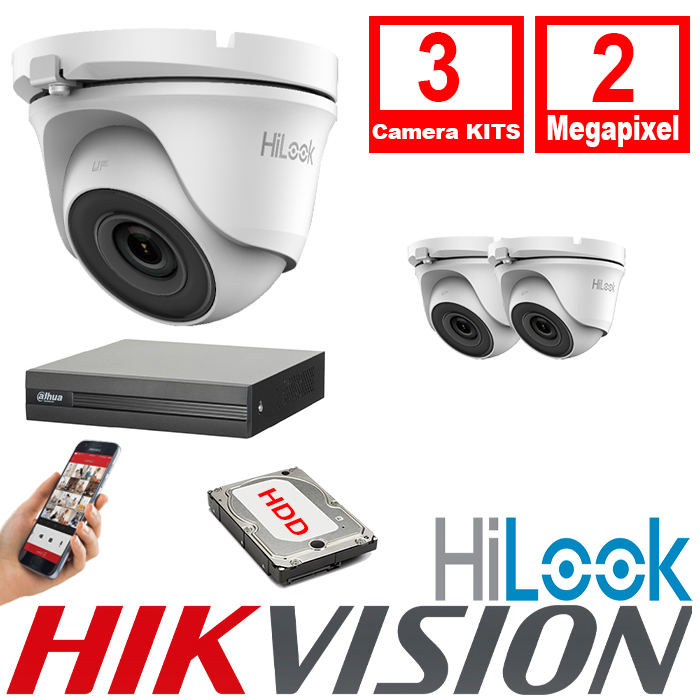 HiLook By Hikvision 3xCameras 2.8mm 2MP CCTV Turret Camera Full HD 20m IR DVR 8 CH 2MP AOC – 3xTHC-T120-MC- DVR-208G-F1(B)(S)